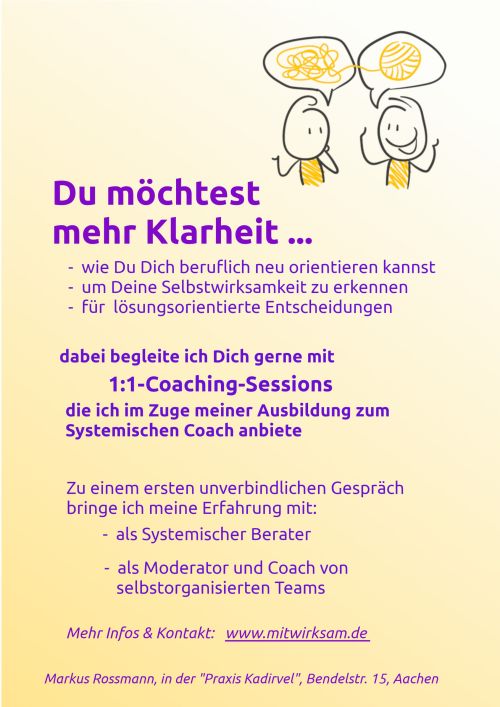 Momentan bin ich im Zertifizierungs-Prozess zum Systemischen Coach nach dem Standard der Deutschen Gesellschaft für Coaching DGfC, und biete in dem Rahmen Coaching-Sitzungen an.